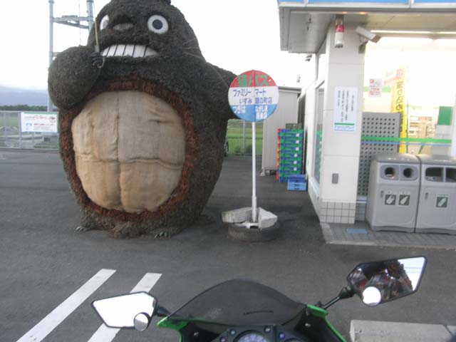 出水から長島に向かう途中にお茶を買おうとファミリーマートに入ったら、駐車場になぜか「となりのトトロ」が立っていました。(???)なぜファミマにトトロがいるかは意味不明ですが、トトロが差している傘にクモの巣がいっぱい張っていて何となく可哀想になりました。