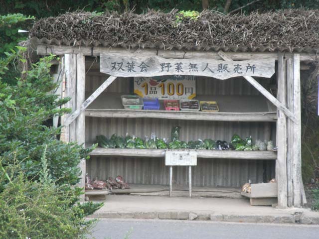 フェリー乗り場前に田舎でよく見かける無人の野菜販売所が。都会でなら勝手に持っていかれて商売にならないかも!
