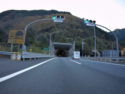 入口に信号機がある肥後トンネル。長さは6340メートルで九州で一番長いトンネルでタンクローリーなど石油や薬品などの危険物を積載した車両は通行できない。八代~人吉の山深さはこのトンネルが物語っている。 |