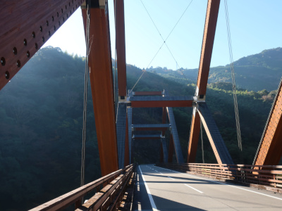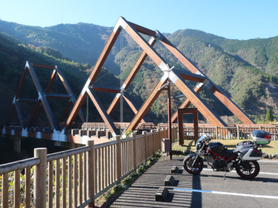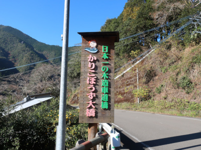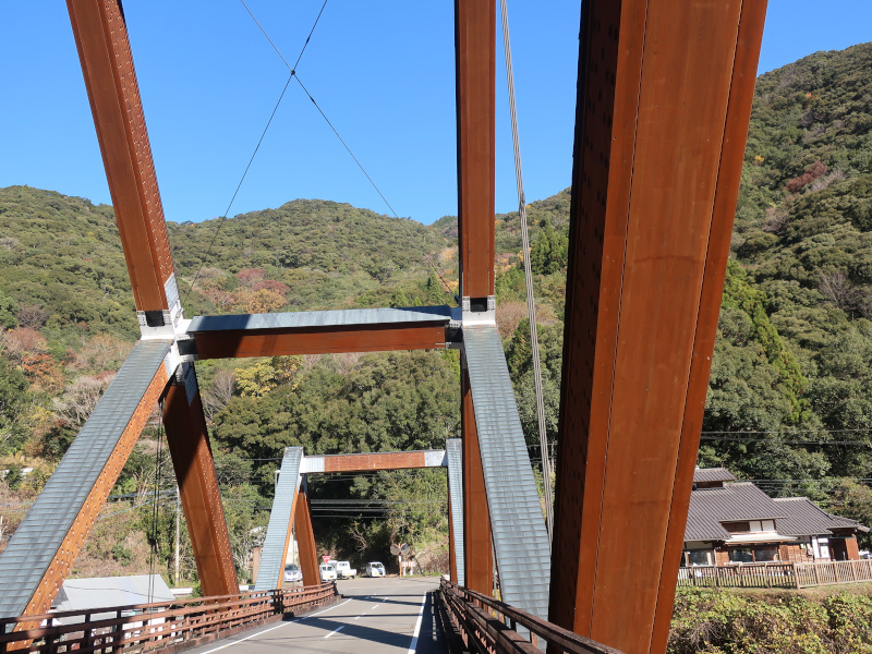 日本一の木造車道橋、かりこぼうず大橋。なぜクルマが通るのに木造なのかはよくわからないが観光橋の一種だろう。 |