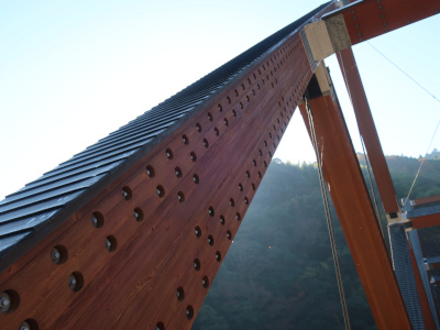 近づいて見ると確かに木造だが雨で腐ったりしないのだろうか。実用的にコンクリート橋と比べて木造橋のメリットが思い浮かばないが、景観やデザインは素晴らしい。 |