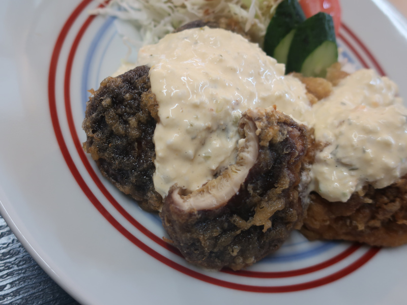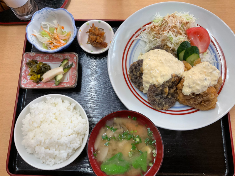 百菜屋のしいたけ南蛮定食が出てきた。しいたけを食べると10年前と同じで口が味を覚えていた。味は当時と同じく素晴らしくて、しいたけとタルタルソースが本当によく合う。小鉢も一品一品も丁寧に作られているのがよくわかる。46年生きてきて色んな定食を食べてきたが、この百菜屋のしいたけ南蛮定食は5本の指に入るだろう。(これで850円は本当に素晴らしい) |