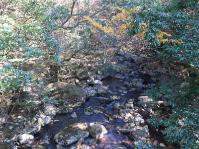 人吉から西米良を走っていても紅葉は見えなかったが、西米良から東に向かう道のりでも紅葉は見えない。落ち葉がないからまだ紅葉には早かったのか。 |
