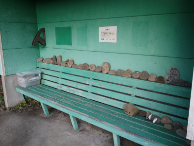 ベンチは既に座る場所ではなく、オブジェを置く台座のようだ。石の表情が面白くて発想がいい。 |