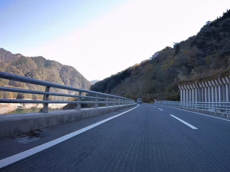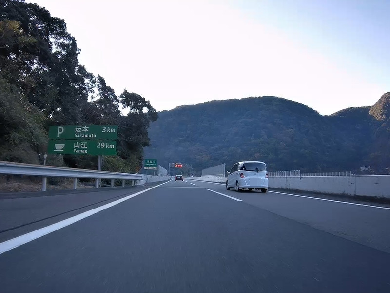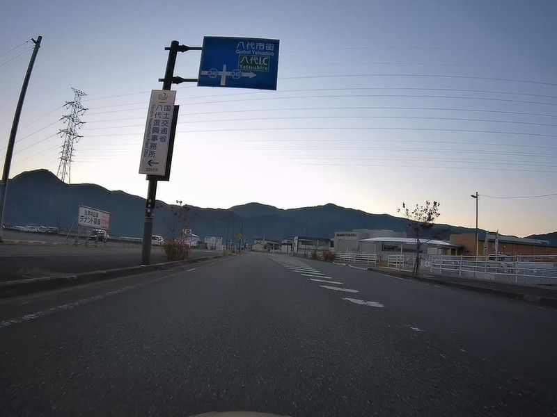 早朝の高速移動はかなり冷える。八代IC~人吉ICはインターチェンジ間の距離が日本最長(38.5km)らしいが、そのせいか山深く、陽も出てこない。 |
