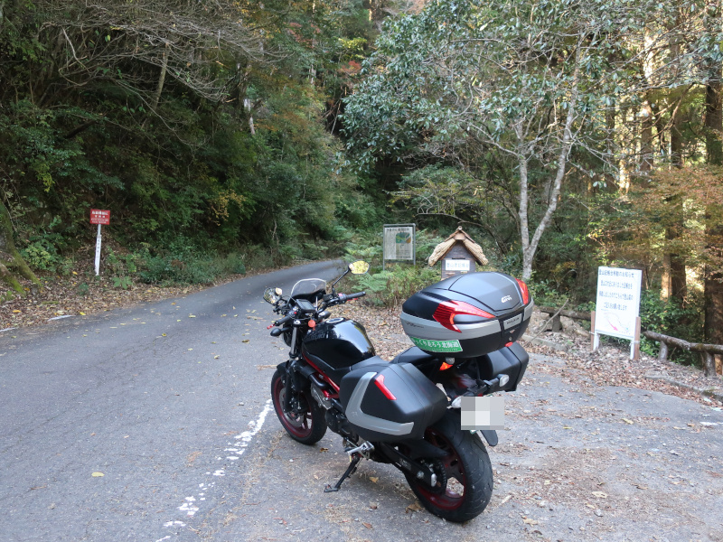 狭隘道路から15分ほど進んできた先でクルマが何台か停まっていたのでバイクを停車する。ここから矢研の滝という場所に行けるらしい。 |