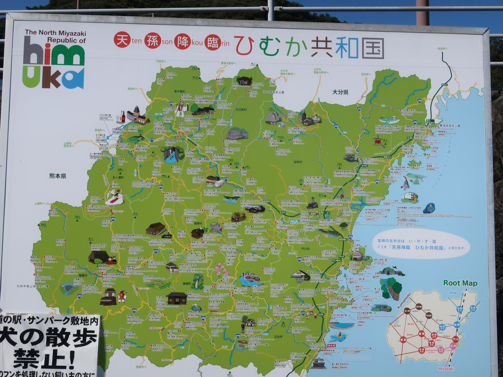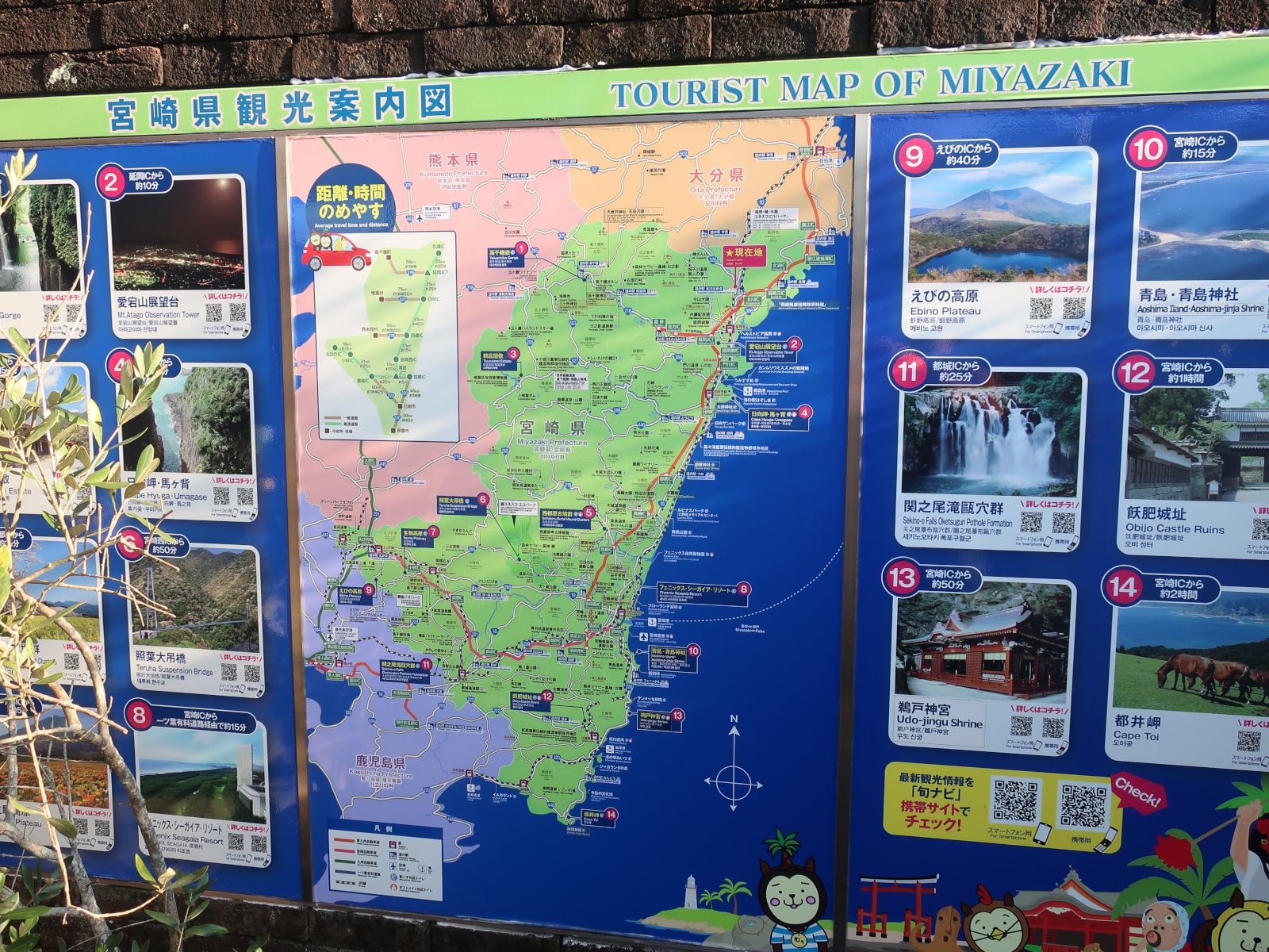 宮崎県の観光案内板。宮崎県も北部と南部でまったく魅力が異なるのがわかる。都城や日南、串間といった南部は南国という感じがするが、日向や延岡、高千穂は南国とまではいかずに九州の中腹という感じがする。 |