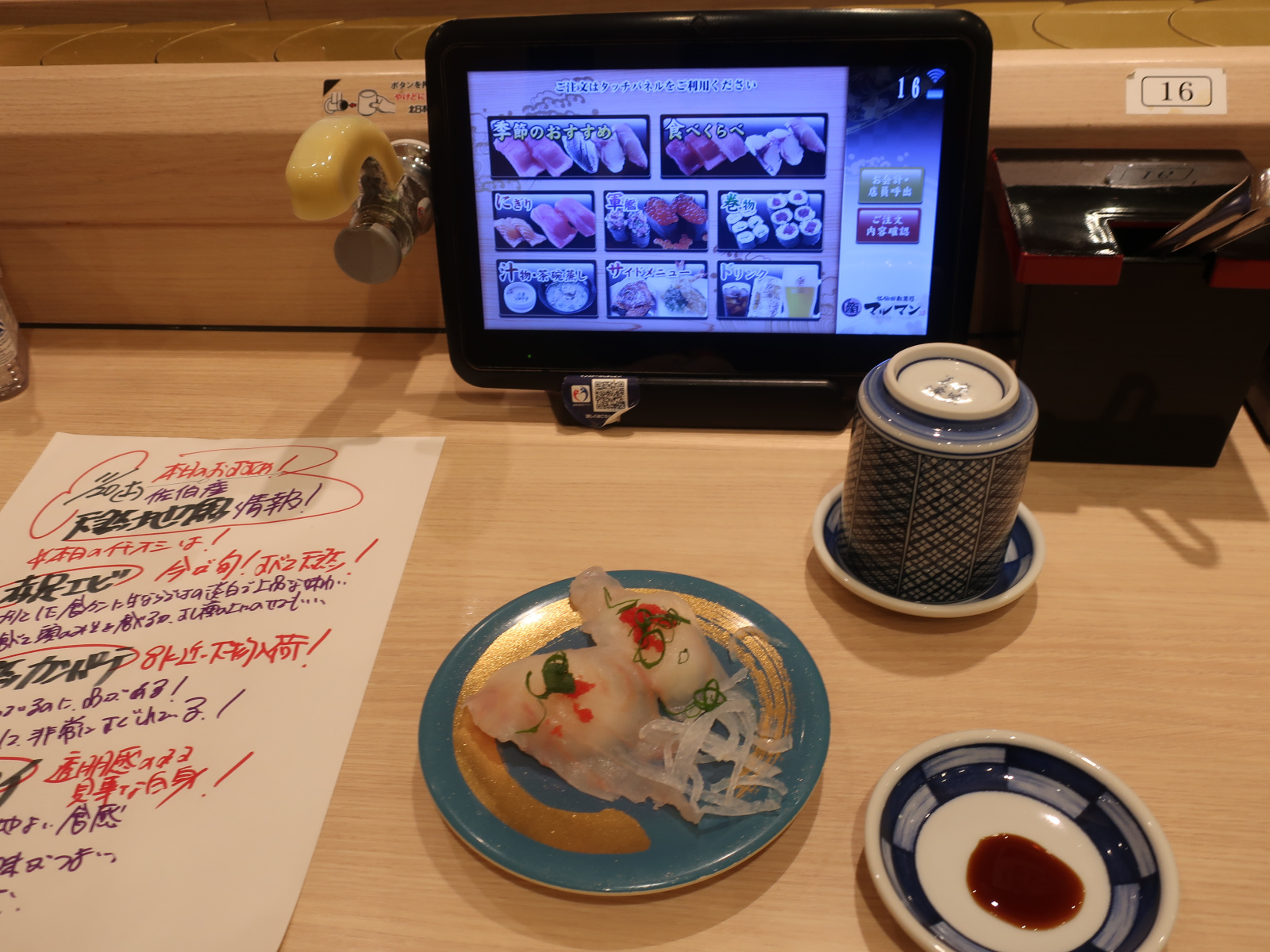 そしてやってきたのはマルマンという回転寿司。佐伯といえば寿司で本当は普通の寿司屋に行きたかったが、ホテルの近くに食べる場所はないし、バイクで普通の寿司屋を探すのが面倒だったのでとりあえずここにした。 |