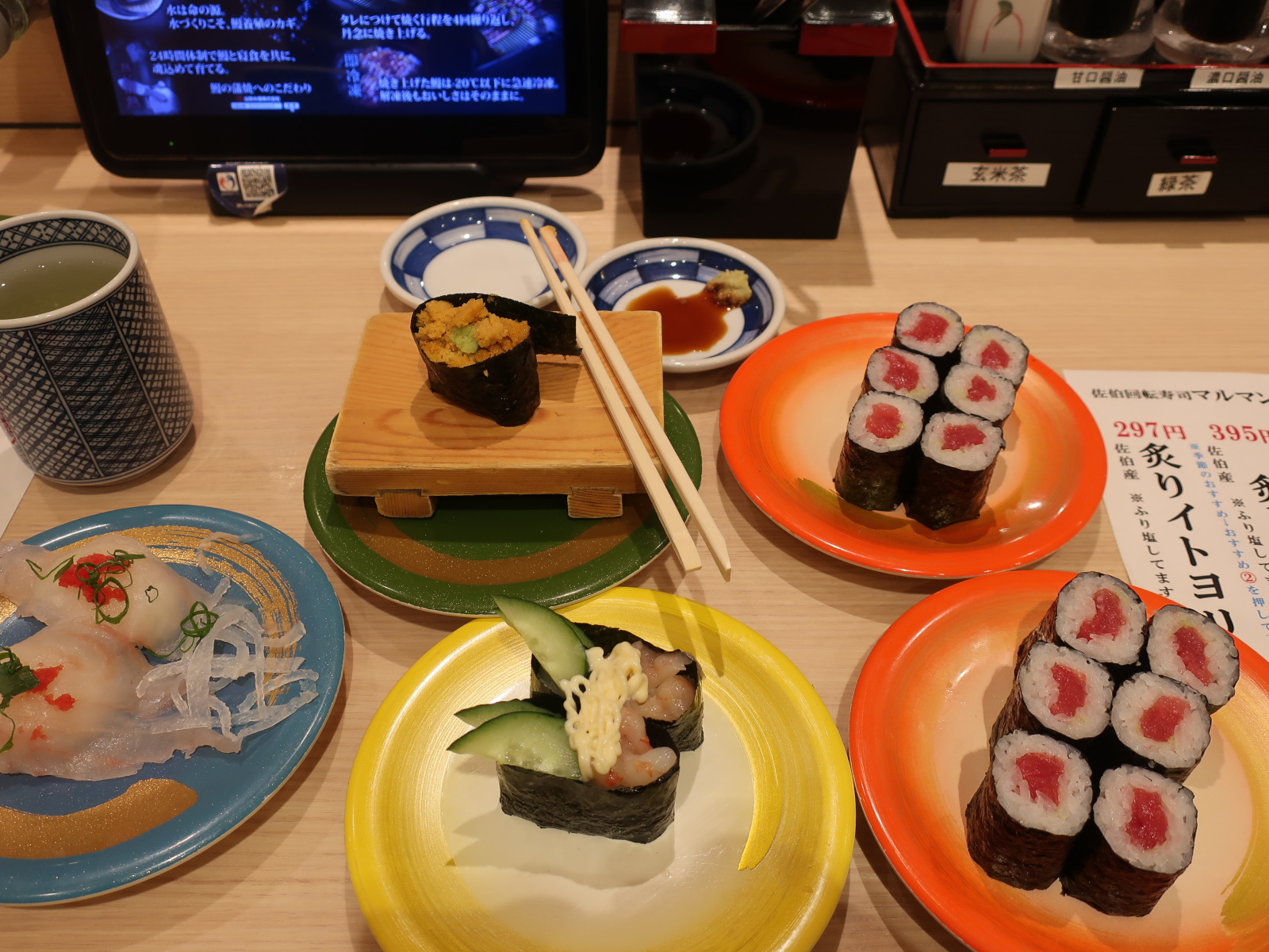 ここの寿司は回転寿司といいつつ、寿司は回っておらず、普通に職人が握って皿を渡してくれるシステム。肝心の味は美味しくて大満足。ボクが寿司で好きなネタは鉄火巻き。寿司といえばマグロだが、マグロの握りより海苔に巻かれた鉄火巻きのほうが好物でこのあと2皿も追加で頼んでしまった。 |