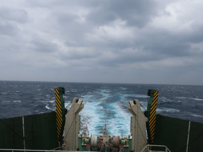 5時50分を過ぎてフェリーが奄美大島を出発する。鹿児島からかなり沖縄寄りに来ていると思うんだけど、沖縄までまだ遠い。 |