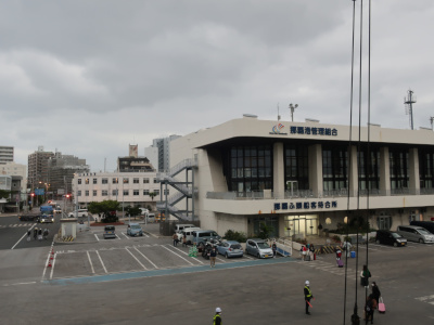 丸1日過ごした船を後に下船する。やった、沖縄だー!でも空は九州の空と変わらず曇り雲。明日以降は何とか快復して欲しいがどうなることやら。 |