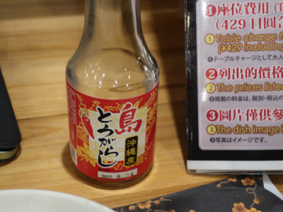 今回、目をひいたのがこの島とうがらし。泡盛漬けのとうがらしだが、沖縄そばに入れすぎて若干酔ってしまった(笑) 結構強烈な調味料だ。 |