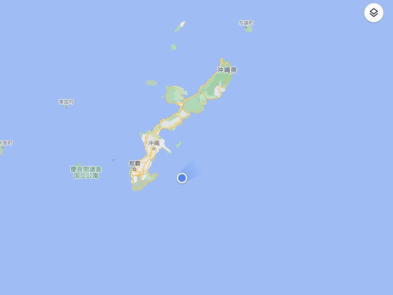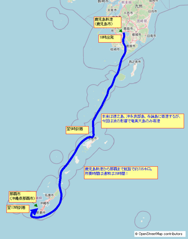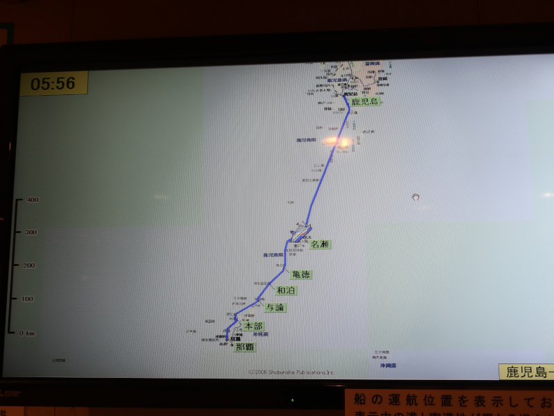 目が覚めてまだ沖縄に着かないのかタブレットで現在地を確認したところ、フェリーは現在、沖縄本島の南側を通っているようだ。当初の予定だと北側だったと思うが、何故南側を通っているのだろうか? |