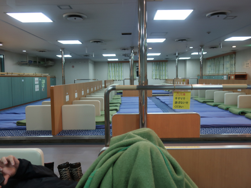 寝るときは周辺に結構人いたが、奄美大島でほとんどの人がいなくなった。部屋の人数が減ってラッキーと思っていたら、今度は新しい顔ぶれが続々と部屋に入ってきた。奄美大島から沖縄まで利用する人も多いようだ。