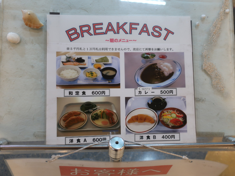 食堂の朝食メニュー。朝からカレーもあるようだが、昨日の揚げ物続きで若干胃が持たれ気味なので朝食はパス。 |