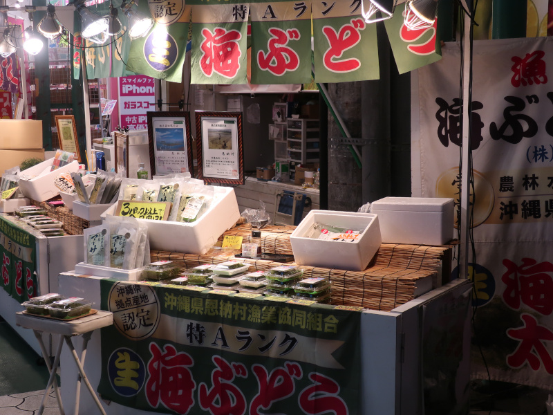海ぶどうもある。これも沖縄名物として有名だが、その値段をみてびっくり。100gが1000円!サーロインステーキ並み。ただ海で生えているだけなのに(笑) 名前は海ぶどうだが、実際にはぶどうとは似ても似つかないけどね。 |