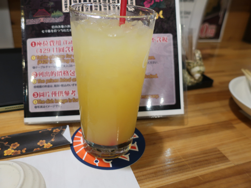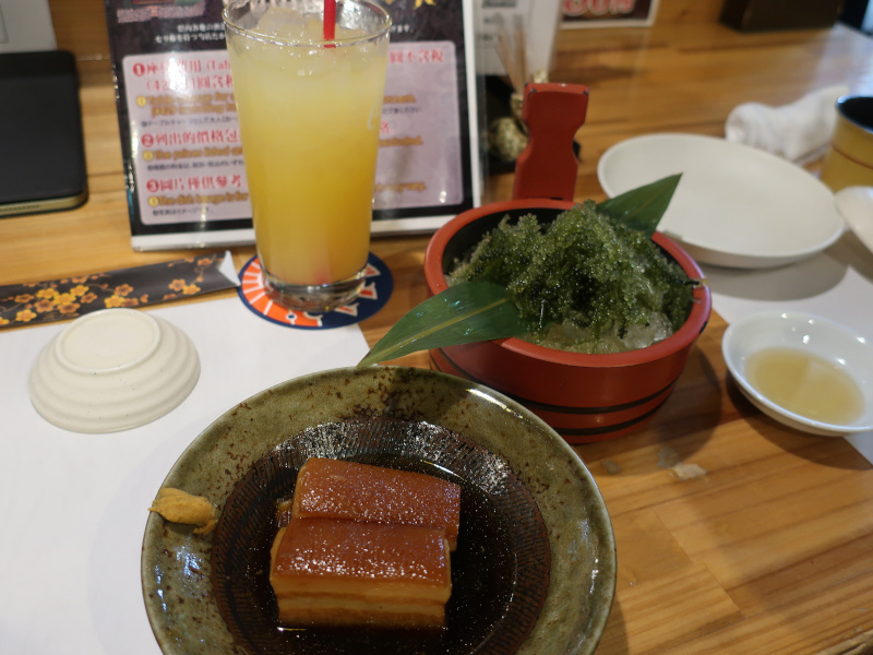 中に入って早速注文する。シークワーサーのジュースとラフティ、海ぶどうだ。味はそれなりで可もなく不可もなくといったところ。シークワーサーが思ったより酸っぱい。沖縄名物の定番。 |
