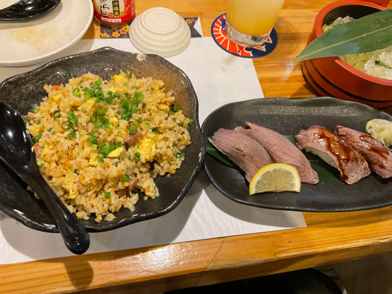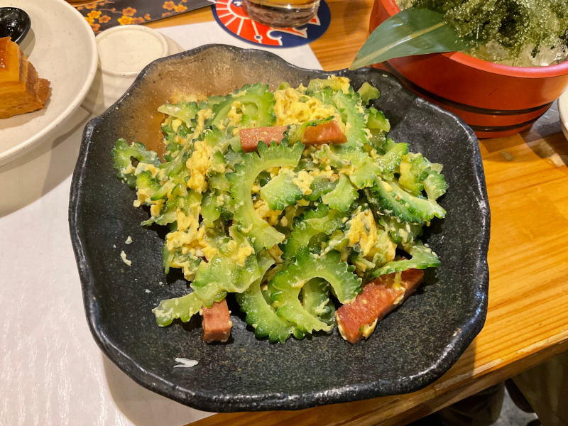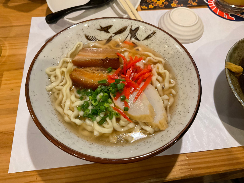 続いて沖縄そばにゴーヤチャンプル、アグー豚など。こちらも沖縄定番の料理。味は可もなく不可もなく。 |