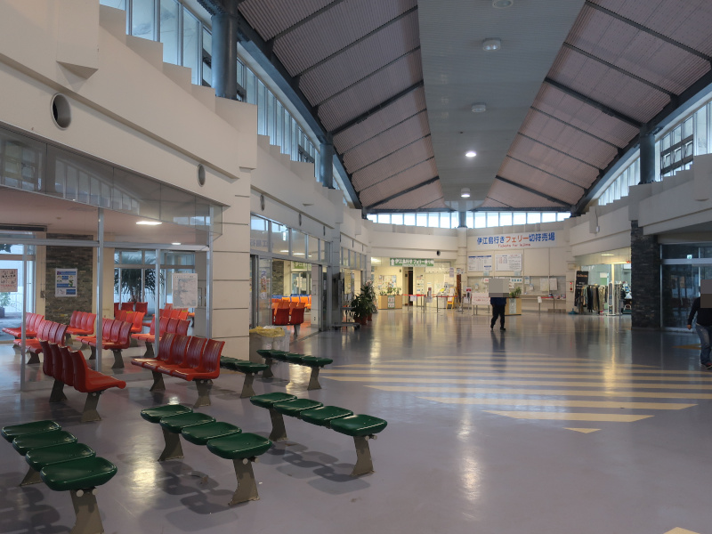 本部港フェリーターミナルは地方ターミナルにしては結構綺麗で立派。この本部港からは伊江島というところにもフェリーが出ているらしく、手続きをしている人が多い。 |