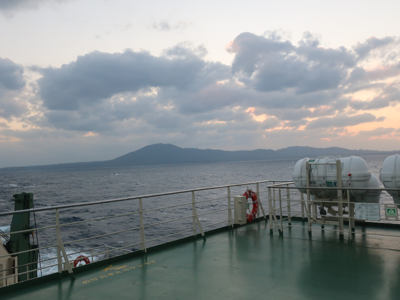 フェリーで仮眠していると夕方になった。与論島から先がとにかく揺れて座っているのすら辛い状況。なので強制仮眠するしかない状態。あーあ、早く鹿児島に戻りたい。 |